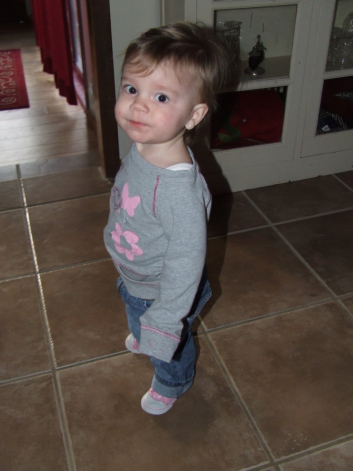I did happen to take some pictures of the little cutie though. She has been really fun lately. Just blossoming into a little girl….where has my baby disappeared to?? She can wear her hair in a ponytail now, she talks ninety-to-nothing, runs around really fast and is just the cutest ever. She has learned that she can “help” mommy do some things, like sweep….which I think she makes more of a mess by dragging the dirt all around the house instead of centralizing it into a pile. She also tries to do laundry by coming in and finding her clothes in the dirty laundry piles, and taking them throughout the house for me to later find and put back in the laundry room. Oh what else, oh, yes…she also does dishes with me….I will have both racks out and be unloading them….when i take a plate out…turn around to put it in the cabinet, I will turn back and the whole dishwasher will be closed up and she will be standing there looking so proud of herself for knowing how to push the racks in and close up the door 🙂 Such a help! lol.