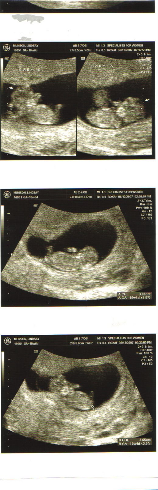 Lastly……………………….we think they are boys…..the ultrasound tech said it would be very unlikely to see what they were, but when she started poking around we both saw a little “something something” on both of them….so I go back in two weeks for another ultrasound and maybe we’ll know for sure then. That was like the one scenario that we didn’t have a second potential name for…..so we’ll be putting our thinking caps on now π And Mel, yes…I do go more often and get ultrasounds every time since I am high risk.