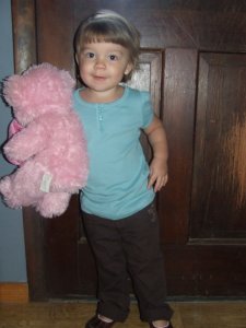 So, today was the big day! BJ and I woke her up together and she was so excited! She ate breakfast, got in her new school clothes, put on her new cowl backpack and carried her new pig lunchbox. She was a doll!