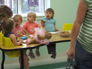 She is in the Tikes class which is for one-year-olds, but since her birthday falls after the cut off she will be in that class all year even though she’ll be 2 for most of the time.