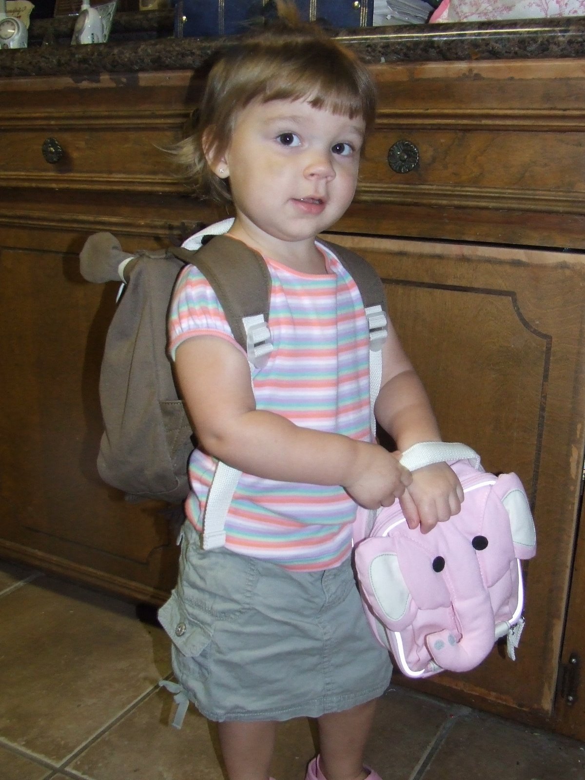 So, today was the big day! BJ and I woke her up together and she was so excited! She ate breakfast, got in her new school clothes, put on her new cowl backpack and carried her new pig lunchbox. She was a doll!