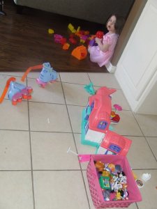 So since we moved I have everything, except a few lingering boxes in my office, unpacked that is IN the house. The garage is another story. One side houses our car, so if you ever drive by and don’t see it, doesn’t mean we aren’t home. The other side is 1/4 packed out with, garage sale stuff (hoping to have one in March) and the other 1/4 is stuff waiting to make its way into the house. Today I thought of Hayden’s Little People Doll House and realized I hadn’t seen it so it was probably still out there. So we ventured out into the maze of boxes and wahlah! There it was. We also found her school backpacks and lunch boxes and her mega blocks. Its like it is Christmas all over again!