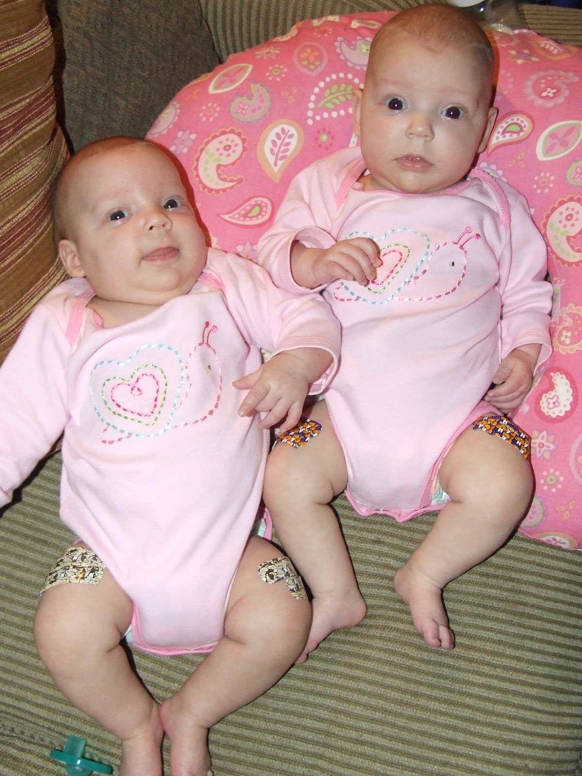 Preslyn and Ella each had to get FIVE SHOTS A PIECE! I freaked when I saw the tray of needles and then asked, “Is that just for one of them??” Poor babies SCREAMED THEIR GUTS OUT. It was awful. Our pedi was very happy with them though and said they are doing great. Good news…no more synagis shots (RSV preventive shot) WHOOHOO!!!! So we go back for their 6 month checkups and no more monthly shot checkups. She also said we could start easing into some cereal when I felt like Preslyn was ready and then to solids. I’m trying to hold her off until after Ella’s surgery so we can all be on the same schedule together, but we’ll see how that goes. She’s a little hungry monkey. They are both pretty close to being totally on par with development. They should be rolling more, but they are trying so that is excellent. Preslyn’s neck is a little sluggish sometimes, but she just needs to keep strengthening it. Other than that they are perfect little “spuds” as we commonly refer to them.