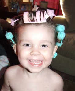 Hayden and I had a little fun this weekend and put her hair in sponge rollers. She took them out before they were ready so we had no curls to show for our effort, but she looked so hilariously cute with them in and she felt so big and girly and loved having them in. She is very into getting her own clothes on right now, brushing her hair, wearing her “lipsticks”, perfume, deodorant and nail polish. Such a girly girl. Although today while we were at Target she picked out a brown Cars shirt out of the boy section (its her favorite movie) and I let her get it. She’s having a rough time with her lungs right now, so we are back to breathing treatments …joy joy. Hoping that this change of weather will be easy on her.