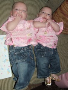 Let’s see what else…oh yes. Yesterday the girls turned 6 MONTHS OLD! Can you believe it??? They are getting so big and more and more active. Preslyn surprised us with her first TOOTH yesterday!! You can’t see it yet, but you can feel it and she has been working her tongue on it so much. That explains the last week of her restlessness and crying spells. Poor baby. She is cutting the bottom left front one. Still no sign of any for Ella. Pres is also really trying to crawl, but still not doing it yet. Ella started rolling over again. She hadn’t done it since her surgery, but started yesterday.
