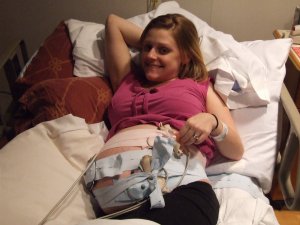 This is what it looks like to be monitored….its quite and ordeal and I have so many bands strapped to me. I will be glad to see those go away, to never again return 🙂 Don’t mind my horrendous appearance. I’m so pale from being inside for 6 weeks, plus having anemia on top of that. I told my mom I was going to have to wear my makeup for my delivery just so they don’t send me to the morgue afterwards on accident 🙂