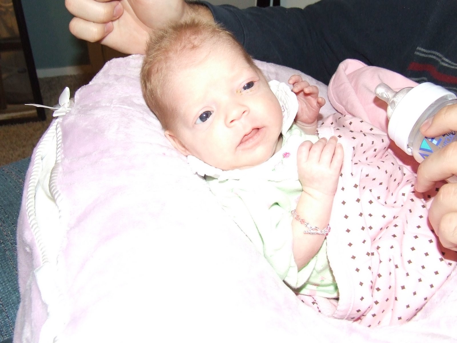 I’m sorry for the lack of posting, I’ve been getting calls requesting an update so here I am 🙂 We have had no internet since Saturday so I have been really behind on everything, plus we have all been under the weather a bit, except for Preslyn. She is as healthy as ever. I took her for her second round of synagis yesterday (that’s the shot to hopefully prevent RSV) and her weight check and she is 7lb. 7oz! Her big sister Ella is 8lbs.4oz. and progressing beautifully. Today she is up to 47cc’s per feed so she’s nearly3/4 of the way to full feeds. She needs to be at about 75 or so and tolerating them good in order to come home,which may be very close to the time she needs her second surgery.